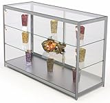 Tempered Glass And Silver Aluminum Frame Retail Showcase With 2 Adjustable Shelves And 4 Halogen Lights, 60 x 38 x 23-3/4-InchUse this display showcase alone or part of a complete cash wrap display configuration. Crafted from tempered glass, this display case has a silver aluminum frame with floor levelers to ensure stability on uneven surfaces. There are 2 adjustable shelves so that a wide variety of merchandise can be displayed and 4 adjustable 20-watt halogen lights illuminate the entire case. Sliding glass doors lock to provide additional security when used in a high traffic area. Dimensions: Overall: 60"w x 38"h x 23-3/4"d Viewable Area: 35"h Shelf Dimensions: 58-1/2"w x 21-1/2"d Door Opening: 28"w Weight: 262 lbs.