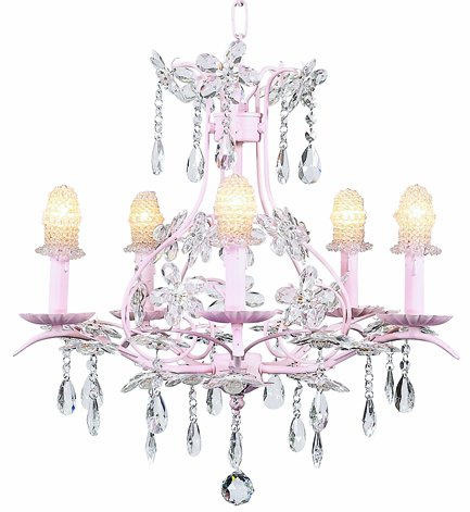 Jubilee 5-Arm Cinderella Chandelier in Pink with Clear Bulb CoverThese beautifully hand crafted, delightful chandeliers are the perfect finishing touch to any nursery, children's room, playroom - or even the bathroom! With hand crafted detailing on the center column and arms, these children's ceiling fixtures are one of a kind chandeliers that truly offer a unique look. Brighten up the old nursery, redo your kid's room, or illuminate any space in need of some charm! Chandeliers accommodate up to 45 watt bulbs without shades, 25 watt bulbs with shades. Light up your kid's room or nursery with the elegance and charm of a light fixture from Jubilee Collection! Jubilee Collection offers a wide array of kid's lighting including spectacular chandeliers, darling sconces, adorable shades, whimsical lamps and other adorable room accessories. Each piece from Jubilee Collection will be sure to make a unique statement in any kid's bedroom, playroom or nursery! Jubilee lighting products are produced to use with 120 voltage. This type of voltage can be used in several countries, including the United States, Canada, Mexico and South America. However, in many European countries, a conversion adapter will be required for the use of this product. Conversions adapters can be purchased in many European and Asian countries. Please consult your local listings for the availability of a converter in your area or call our Customer Service Department with any questions you may have.
