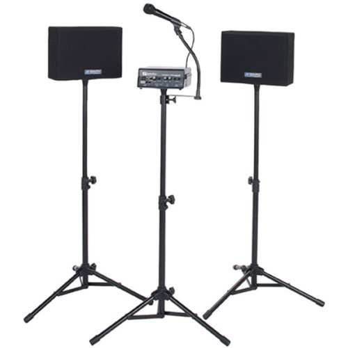 Amplivox SW230 Voice Carrier with Case?The Amplivox SW230A30 Voice Carrier is a complete public address system in a rolling case. It includes a wireless lapel microphone with 15-foot cord, an optional wired handheld microphone, two 6" x 8" dual-module Jensen speakers (each with 40 foot cable), a 50-Watt amplifier with 3 microphone inputs, 3 adjustable tripods, and a carrying case with wheels and luggage handle. This unit will provide up to 200 hours of use with 10 D-cell batteries. The optional AC adapter (S1460, sold separately) allows the unit to be powered from an AC socket.
