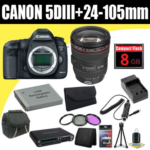 Canon EOS 5D Mark III 22.3 MP Full Frame CMOS with 1080p Full-HD Video Mode Digital SLR Camera w/ EF 24-105mm f/4 L IS USM Lens + LP-E6 Replacement Lithium Ion Battery + External Rapid Charger + 8GB Compact Flash Memory Card + 72mm 3 Piece Filter Kit + Carrying Case + SDHC Card USB Reader + Memory Card Wallet + Deluxe Starter Kit Deluxe Accessory Kit