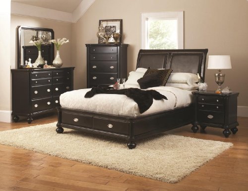 #The beautifully designed bedroom collection features a padded black leather like vinyl headboard with decorative nickel finish nailheads and storage drawers in the footboard. Matching case pieces are constructed with dovetail drawers and smooth metal on metal drawer glides. Finished in a gorgeous black with a slight sheen.Finish Dark WoodColor BlackBed Size California King