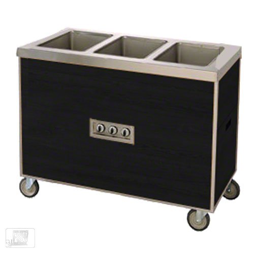 #A portable hot food unit can make so many hot food storage and serving tasks easier in practically any commercial food service establishment, but especially for restaurants that feature a hot buffet, special event venues, cafeterias and off-site catered events. The 46" Portable Hot Food Unit - Heritage (HB3HF) from Duke is a durable unit that is convenient and easy to use. This model features sealed wells that have been fully insulated, individual infinite controls and a stainless steel top. Take the hard work out of serving hot food in your commercial foodservice establishment with a portable hot food table. Features: Six foot cord with plug, Heavy-gauge steel body, Three sealed hot wells 12" x 20" with individual infinite controls, Individual brass drains, copper manifolds and brass master valve. Benefits: 300 series stainless steel top improves durability , Includes 5" diameter rubber swivel casters, two with locks, for easy relocation . Additional ConsiderationsElectrical specifications listed above are for 120 Volt single phase model. Additional voltages including 208 and 240 models are available. The body of this model can be finished in one of twelve powder coat colors available from Duke; contact a Product Expert for details at 1-877-877-4379.
